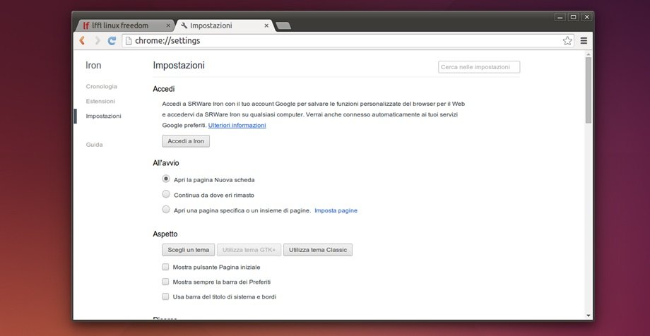 SRWare Iron è un browser basato sul codice sorgente di Chromium creato per fornire le stesse funzionalità garantendo però la privacy dell’utente non inviando a Google varie informazioni della nostra navigazione. Con Iron avremo tutte le stesse funzionalità incluse in Chromium, compresa la possibilità di inserire il nostro account Google per sincronizzare segnalibri, password estensioni ecc il tutto però senza inviare informazioni a Google. Con la nuova versione 35.0.1900.0 Stable di Iron Browser troviamola nuova AURA UI, interfaccia grafica che migliora l’integrazione del browser in Linux oltre a rendere il browser più affidabile e performante.