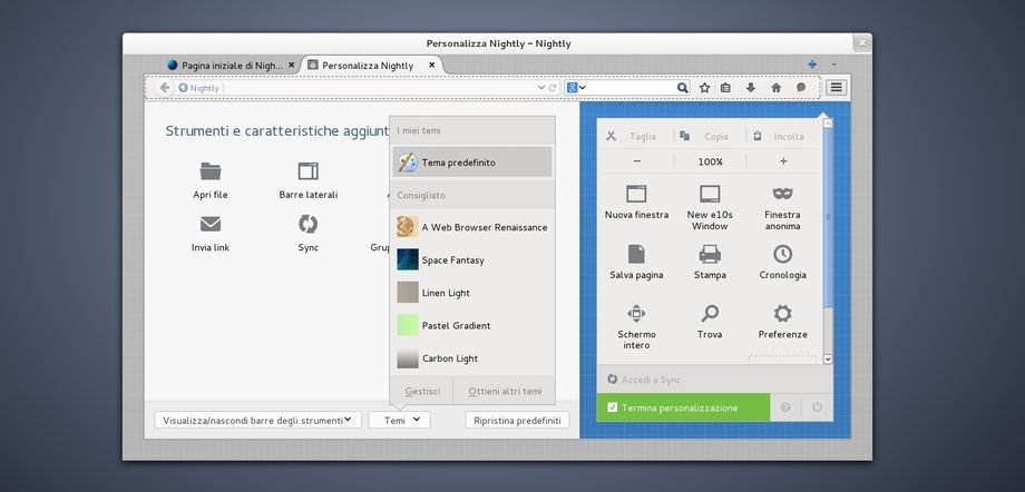 In Firefox 34 accedendo alla personalizzazione del menu troveremo anche una nuova opzione dedicata ai temi con tanto di suggerimenti.