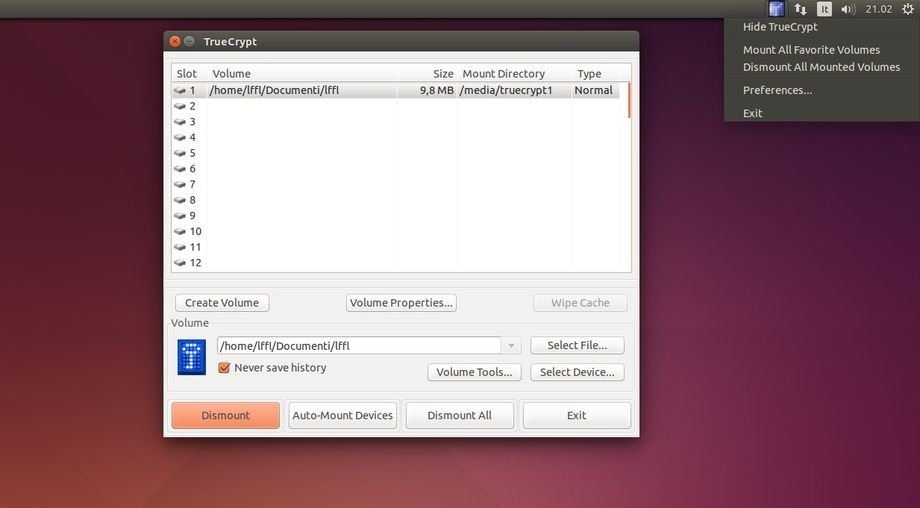 Alcuni developer hanno deciso di migliorare l’integrazione di TrueCrypt 7.1a in Ubuntu includendo un’utile collegamento nel pannello con il quale è possibile montare / smontare facilmente unità disco criptate.