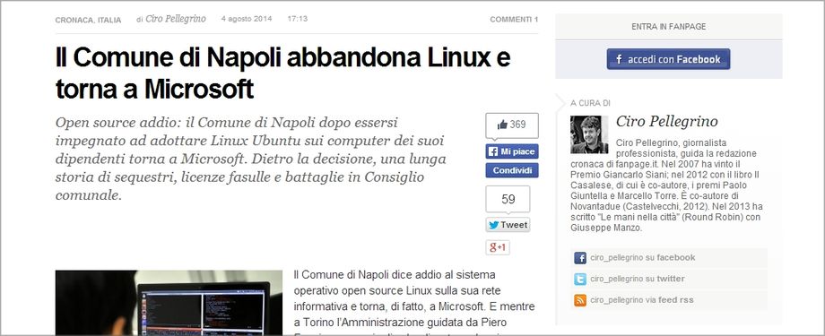 Salve, mi presento, l’articolo di FanPage è impreciso e spero facciano rettifica. Curo la delega all’informatizzazione del Comune di Napoli e nessuna operazione di passaggio voluto da UBUNTU a WINDOWS è in corso. Anzi la riduzione degli sprechi trovati va proprio nella direzione dell’open source.