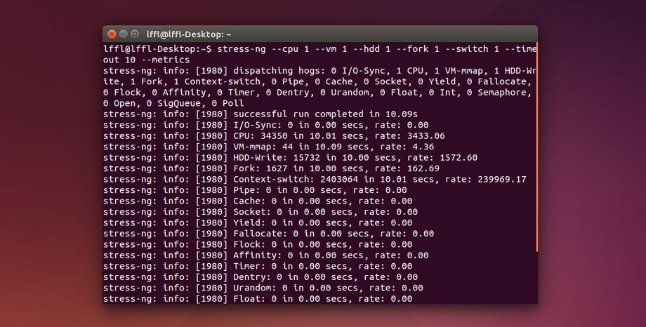 stress-ng --cpu 1 --vm 1 --hdd 1 --fork 1 --switch 1 --timeout 10 --metrics