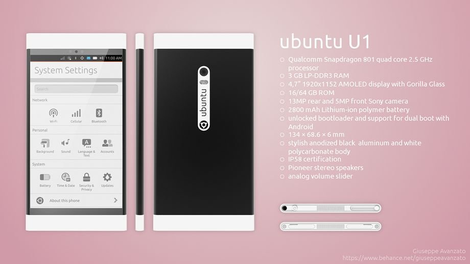 Stando al designer italiano, Ubuntu U1 include sia Ubuntu Touch che Android, misura 134x 68.6 x 6 mm, ottimo anche il sistema audio Pioneer.
