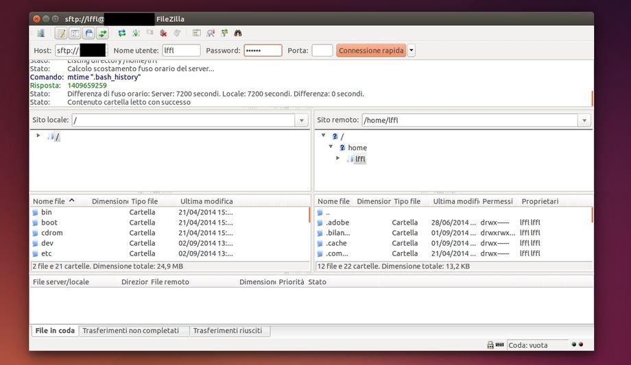 Una volta avviato nella barra degli strumenti inseriamo in Host sftp://indirizzo_ip esempio per l’indirizzo IP 123.456.789 dovremo inserire sftp://123.456.789 mentre in nome utente e password i dati di login della nostra distribuzione.