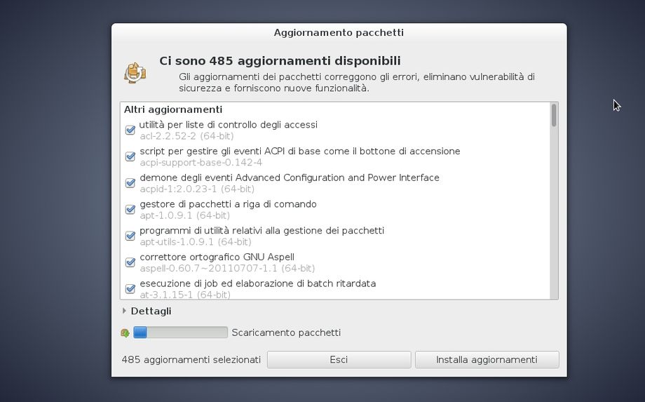 Il gestore degli aggiornamenti è uno strumento molto importante dato che ci segnala eventuali aggiornamenti disponibili, avviando la procedura con un semplice click (operazione che possiamo comune effettuare anche da terminale con il classico apt-get update e apt-get upgrade)