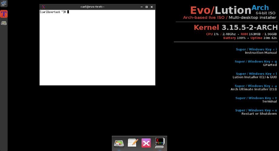 Evo/Lution è progetto che punta a facilitare l’installazione di Arch Linux grazie a lution, installer grafico basato su Cnchi progetto di default in Antergos con il quale potremo installare facilmente il nostro ambiente desktop e applicazioni preferite. Di default Evo/Lution dispone di un’ambiente desktop ultra light basato su window manager Openbox, al momento dell’installazione potremo comunque scegliere di installare Gnome, Cinnamon, LXDE, XFCE, Openbox ecc oppure installare solo il sistema operativo base.