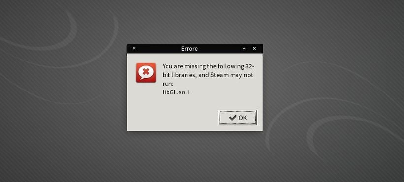 un problema post-installazione del client Steam, all’avvio troviamo una finestra che si segnala l’errore “You are missing the following 32-bit libraries, and Steam may not run: libGL.so.1” che impedisce l’avvio del software proprietario di Valve.