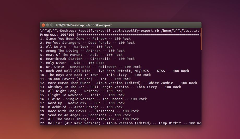 cd spotify-export ./bin/spotify-export.rb /home/$USER/file.txt