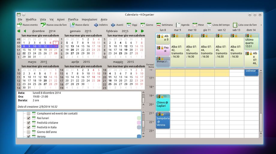 Tra i tanti software sviluppati dai developer KDE troviamo anche KOrganizer, il calendario incluso all’interno di Kontact, il gestore integrato di informazioni personali dell’ambiente desktop “K”.