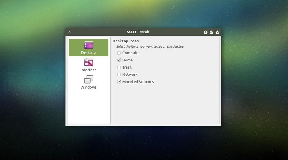 Per facilitare queste operazioni MATE Tweak è suddiviso in tre sezioni denominate Desktop, Interface e Windows. La sezione Desktop di MATE Tweak ci consente di aggiungere o rimuovere nuovi collegamenti nella scrivania come Computer, Home, Cestino, Rete e Partizioni Montate, la sezione Interface invece ci consente di non visualizzare il contenuto della finestra quando questa viene trascinata, attivare o disattivare il Compositing, utilizzare i font del sistema nella barra del titolo e spostare i pulsanti della finestra a sinistra o destra.