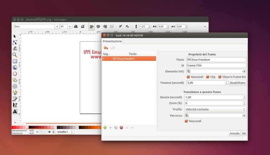 Sozi è uno strumento per creare presentazioni all’interno di Inkscape il tutto attraverso una semplice ed intuitiva interfaccia grafica. Interessante caratteristica di Sozi è quella di creare una presentazione partendo da svariati file vettoriali svg, i quali possono essere zoomati, rotati ecc in maniera tale da poter concentrarsi sugli elementi che si desidera visualizzare.