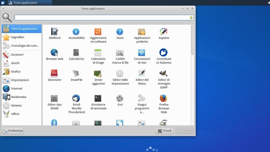 xfce-appfinder ci consente di avviare velocemente le nostre applicazioni preferite accedendo all’elenco completo oppure ad una specifica categoria, possiamo inoltre effettuare ricerche mirate anche sul web, file ecc.