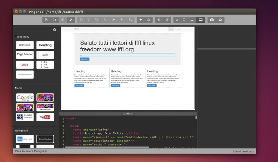 Negli ultimi anni abbiamo visto approdare molto ed utili progetti dedicati alla creazione di pagine web attraverso una semplice ed intuitiva interfaccia grafica. Un gruppo di sviluppatori ha deciso di avviare il nuovo progetto Pingendo, framework front-end multi-piattaforma dedicato allo sviluppo di pagine web in grado di fornire un’interfaccia grafica a Bootstrap.