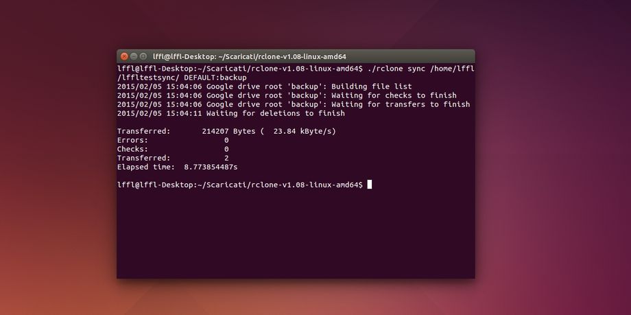 Esempio: se vogliamo sincronizzare la cartella lffltestsync nella directory backup del nostro account REMOTE basta digitare: