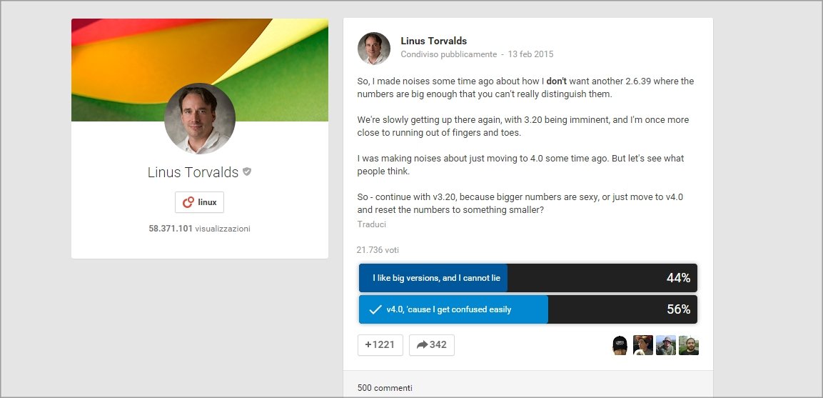 Linus Torvalds ha avviato su Google Plus un sondaggio dedicato alla scelta della numerazione del nuovo Kernel Linux. Sarà 3.20 o 4.0?