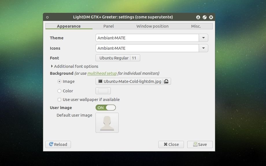 LightDM GTK+ Greeter Settings si suddivide in quattro sezioni: Appearance, Panel, Window position e Misc, nella prima potremo cambiare il tema, icone, font e sfondo del display manager oltre all’immagine dell’utente. Nella sezione Panel potremo attivare o disattivare alcuni applet come l’orologio, lingua ecc mentre in Window Position possiamo cambiare la posizione dell’utente.