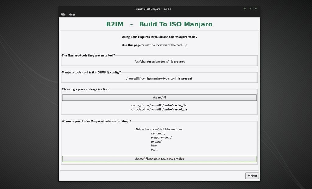 una volta avviato Build 2 Iso Manjaro ( b2im ) dovremo indicare la directory dei profili e una cartella nella quale verrà salvata la ISO della nostra distro personalizzata.