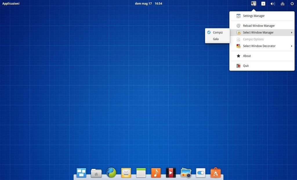 terminiamo la sessione o riavviamo la distribuzione, ed ecco attivo Compiz in elementary OS con la possibilità di operare / configurare il window manager dal collegamento nel pannello.