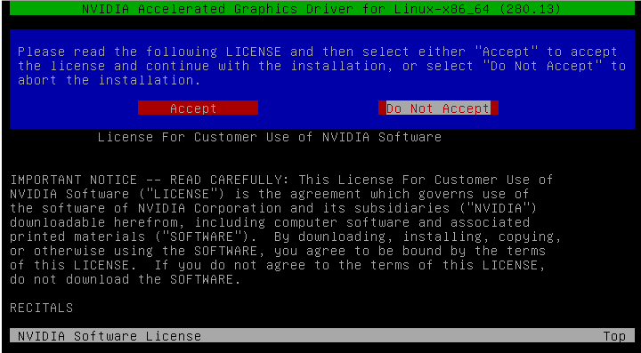 Tutto quello che dobbiamo fare è spostarci su “Accept“, premere Invio ed attendere la fine dell’installazione. Una volta concluso il programma ci chiederà se vogliamo che venga modificato il file di configurazione del server grafico X in modo che il driver Nvidia venga utilizzato al prossimo avvio del sistema, rispondiamo di sì e verremo riportarti al nostro terminale. L’ultima cosa che resta da fare è riavviare il sistema con: