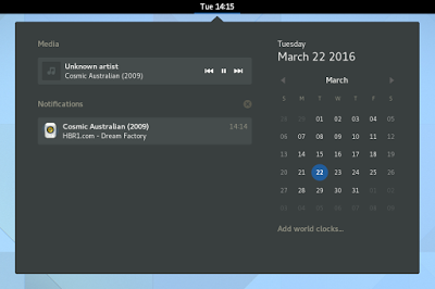 Per questa release gli sviluppatori hanno preferito concentrarsi maggiormente sulle GNOME apps, apportando quasi esclusivamente cambiamenti di entità minore alla GNOME Shell, tuttavia in mezzo a questi uno risulta particolarmente interessante: i controlli multimediali adesso vengono visualizzati nell’area di notifica e dell’orologio, in questo modo l’utente può accedere molto velocemente alle applicazioni musicali e/o video (che supportano MPRIS) che sta utilizzando: