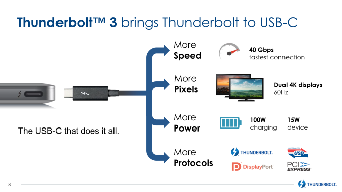 Sviluppato da Intel, lo standard Thunderbolt si interfaccia direttamente con il PCI-Express per ottenere velocità di trasferimento mostruose. La sua ultima versione (Thunderbolt 3, appunto) raggiunge picchi di 40 Gbps, ovvero 5GB/s. Inoltre contiene il supporto al protocollo DisplayPort 1.2 ed Ethernet Gigabit e si può anche utilizzare per alimentare il dispositivo grazie a una potenza massima di 100W.