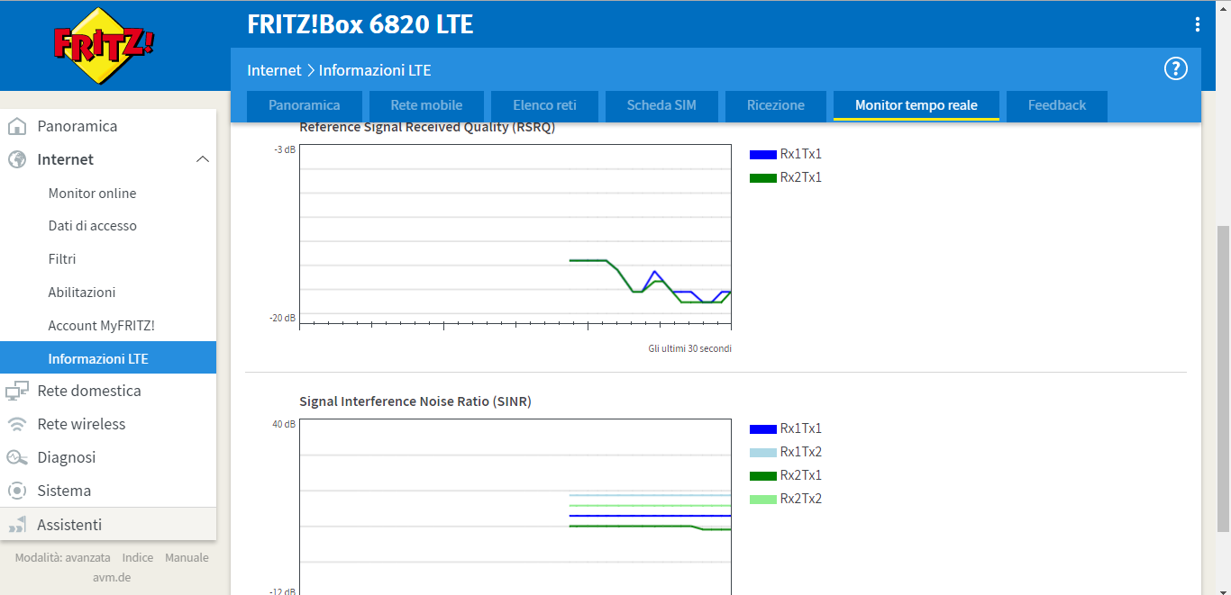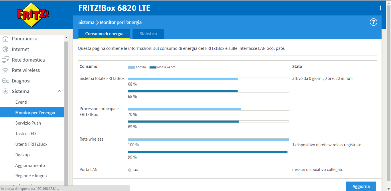 Infine, troviamo la sezione dedicata ai più smanettoni, dove sono presenti le statistiche relative all’utilizzo della RAM e del processore, seguiti anche da un ricco pannello relativo al segnale WiFi ed i canali utilizzati, sia dalla Fritz!Box che dalle reti del vicinato. Presenti anche alcuni grafici relativi all’utilizzo della banda e delle risorse di rete, oltre all’energia utilizzata.