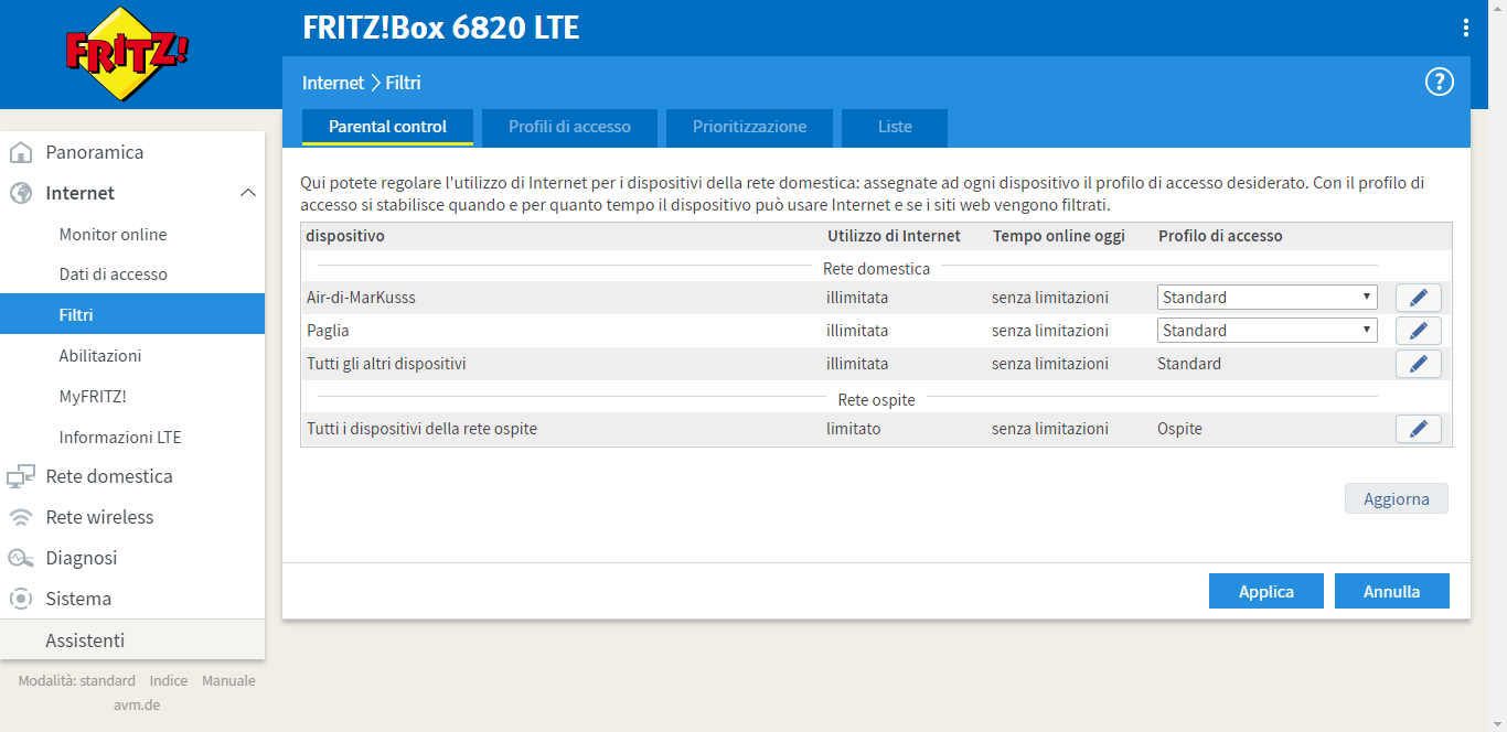Troviamo poi le classiche impostazioni del WiFi, delle abilitazioni e dei filtri, anche se in maniera limitata rispetto ad altri prodotti di AVM.