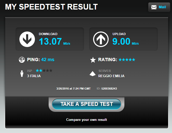 Andando ad eseguire uno Speedtest sotto la rete 4G LTE dell’operatore Tre (H3G), ho raggiunto dei valori leggermente sottotono, specie se rapportato a quelli ottenuti dal mio smartphone, che con la stessa SIM riesce a spuntare qualche Megabit in più in Download, mentre in Upload è proprio il Fritz!Box ad avere la meglio.