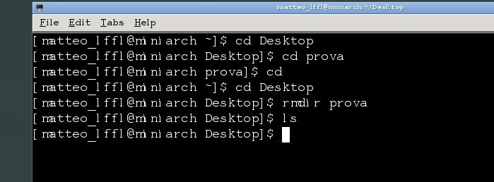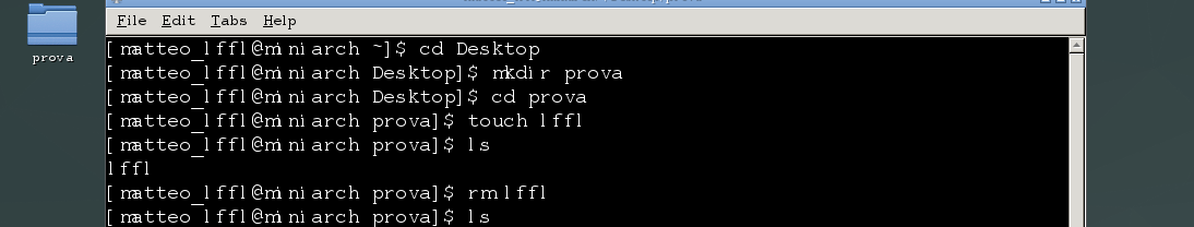 Mi sono spostato sul desktop, ho creato la cartella prova, sono entrato nella cartella prova, ho creato il file ‘lffl”, ho verificato col comando “ls” che il file fosse effettivamente presente, ho rimosso il file controllando ancora una volta con “ls”.