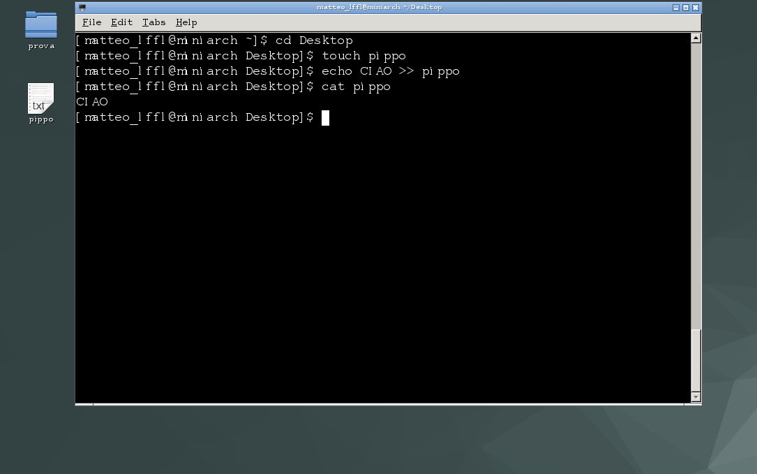 Riportatevi sul desktop e create un file da zero. “touch pippo“. Ora vogliamo scrivere qualcosa in questo file, chiaramente da terminale, come fare?