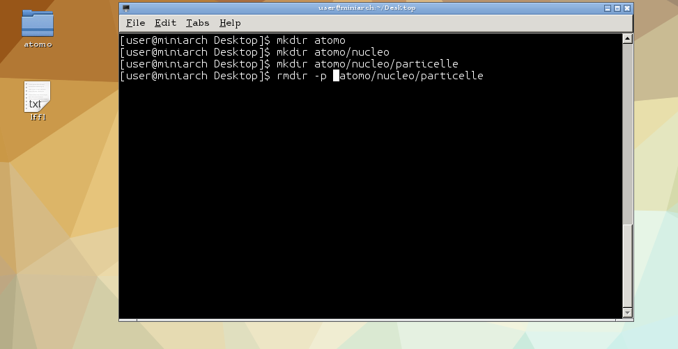 il comando precedente non funziona perchè la cartella atomo contiene a sua volta dei direttori. Come fare? per rimuoverlo occorre utilizzare la ricorsione: “rmdir -p atomo/nucleo/particelle”