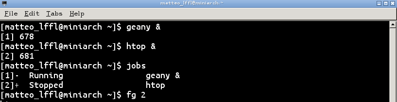 - E’ possibile portare da background a foreground l’esecuzione di un comando utilizzando il comando “fg“. Se vi sono piu esecuzioni in background, bisogna specificare quale portare in foreground indicandone il job number.