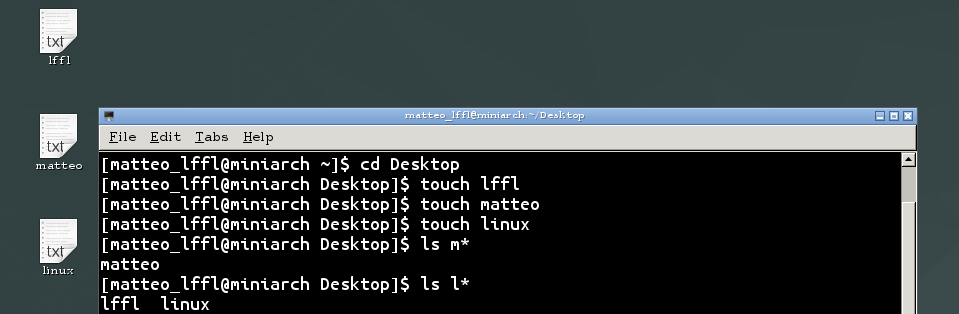 […] – cosi’ facendo potete selezionare un insieme di caratteri (ad esempio cosa va a selezionare secondo voi ” ls ?[a-f]* ” nell’esempio sotto? -> i file” Matteo” e” lffl”).