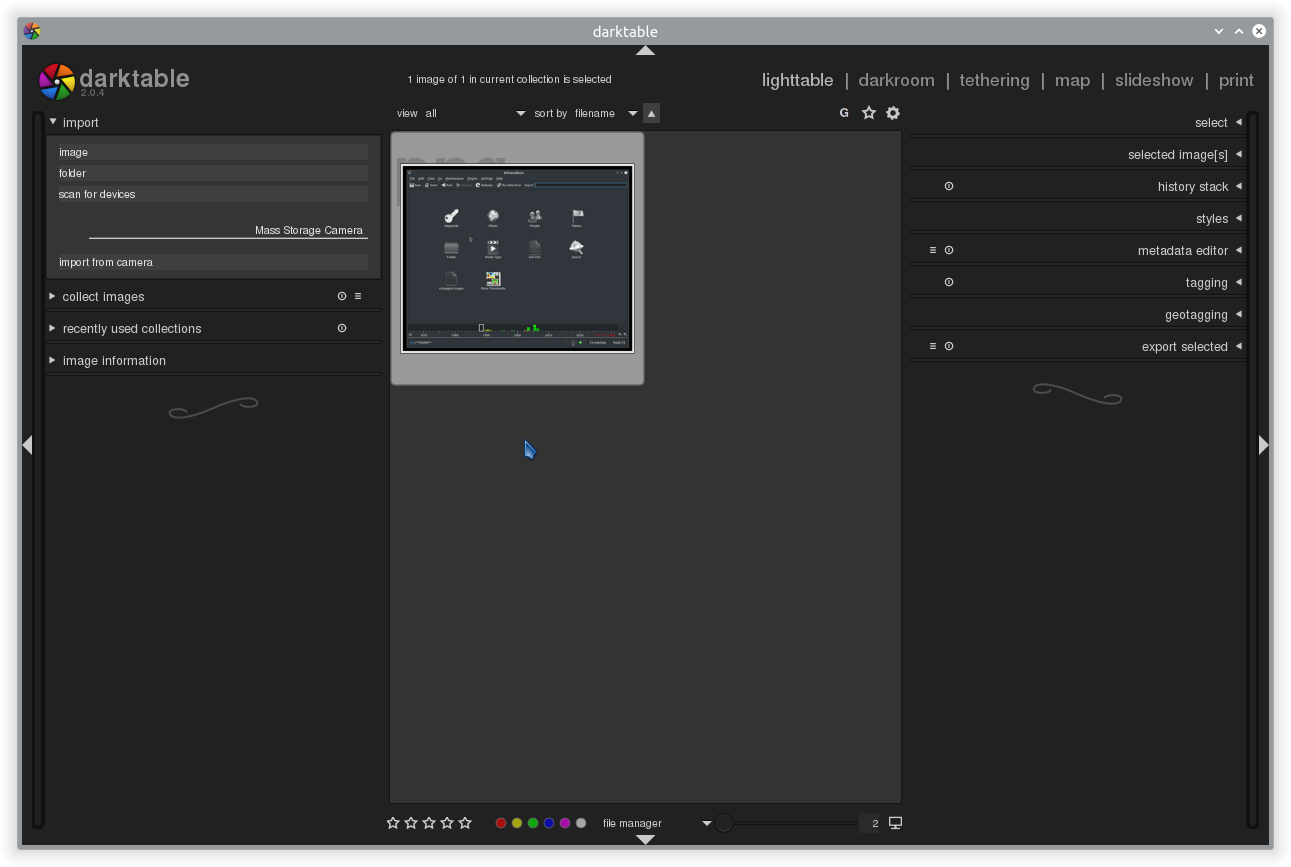 Darktable è più un editor fotografico che un organizzatore. Questo non significa che non svolga bene anche quest’ultimo compito. Darktable presenta un’interfaccia grafica invariante indipendentemente dal desktop environment e supporta molte funzioni tra cui: