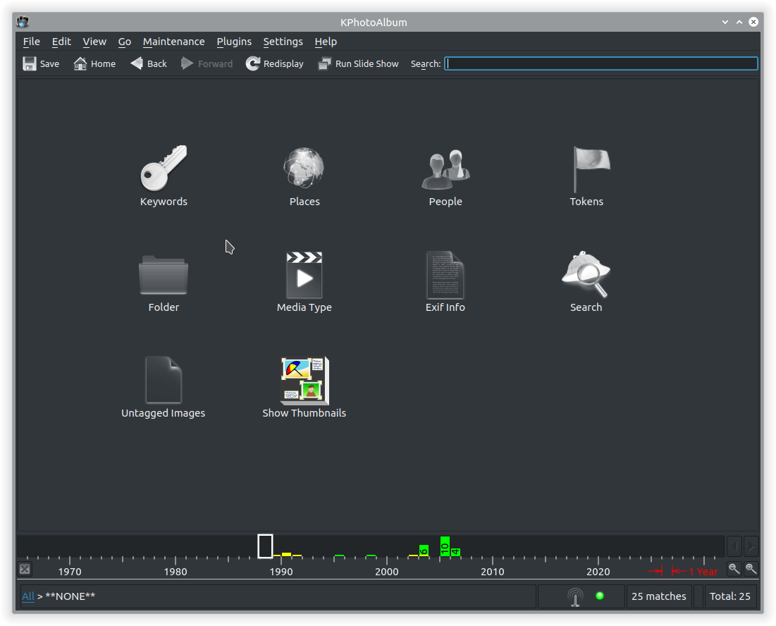 KPhotoAlbum, un photo manager del progetto KDE, offre ottime opzioni di categorizzazione basate anche sulla data. Si possono suddividere le foto per persone, posti, eventi etc. In basso nella finestra troviamo la linea temporale utilizzabile per la navigazione in ordine di data.