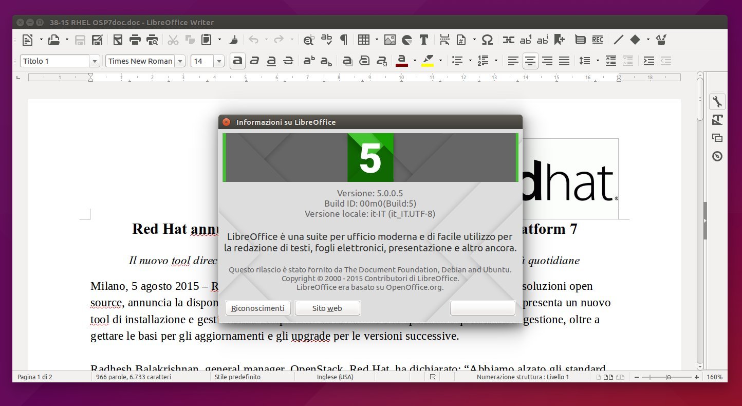 Nella giornata del 5 Maggio, il co-fondatore della Document Foundation Italo Vignoli ha annunciato il rilascio e l’immediata disponibilità al download della nuova versione della famosa suite per ufficio open-source: LibreOffice 5.0.6.
