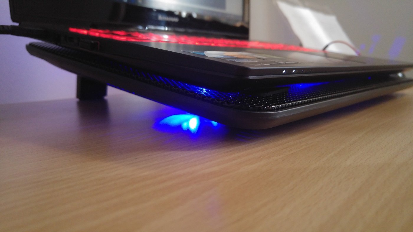 Ho iniziato ad utilizzare da qualche anno le basi dotate di ventole per raffreddamento su cui poggiare i notebook. Questa base è dotata di 3 ventole, con un diametro di quasi 12 centimetri ciascuna, retroilluminate per donare un effetto scenografico interessante e capaci di produrre un flusso di aria abbastanza elevato, che garantisce, anche grazie alla superficie metallica della grata di appoggio, una dissipazione termica ottima.