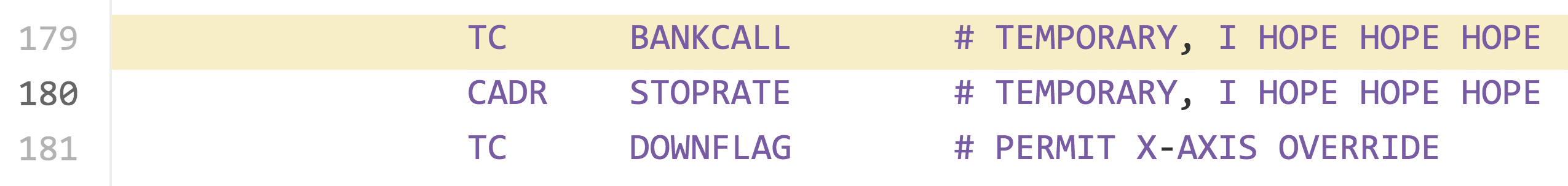 LUNAR_LANDING_GUIDANCE_EQUATIONS.s, dove si vedono due linee di codice pensate per rimanere temporanee, ma che hanno finito per essere permanenti, contro le speranze del programmatore: