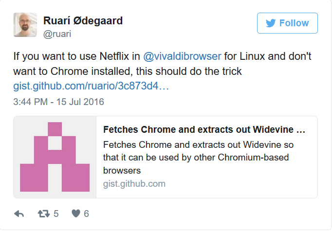Netflix supporta solo Google Chrome e Opera in ambiente GNU/Linux (su Mac e Windows anche Mozilla Firefox e Safari sono supportati). Per fortuna Ruarí Ødegaar è riuscito a trovare una soluzione al problema, soluzione che è basata su un semplice script da eseguire mediante il terminale, vi permetterà di utilizzare Netflix non solo su Vivaldi, bensi’ su qualsiasi browser open-source basato su Chromium.