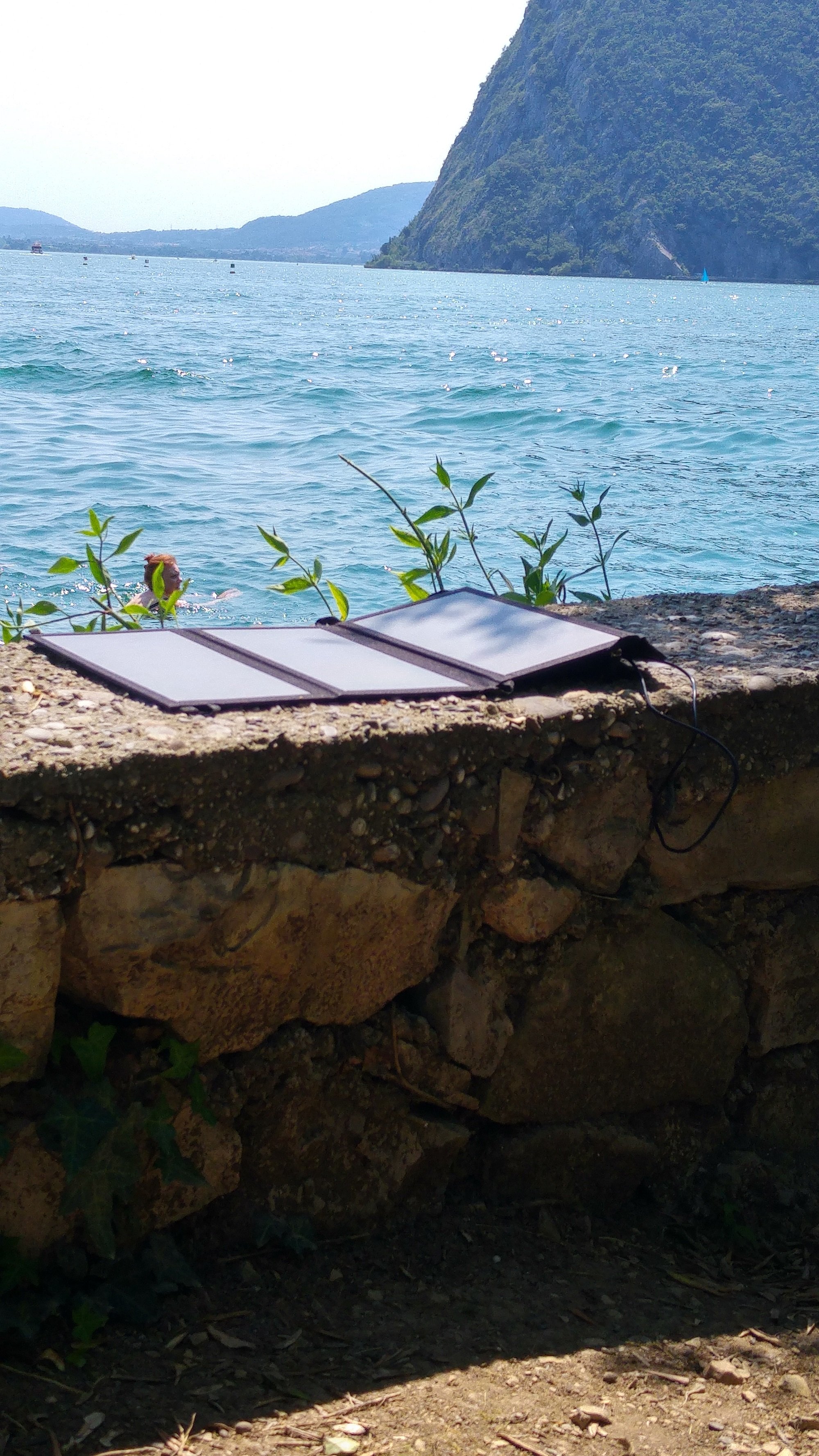 Finita la passerella io e i miei compagni di viaggio ci siamo sistemati sulle sponde del lago e, dopo aver tirato fuori il dispositivo CHOETECH, accompagnato da sguardi perplessi e richiedenti spiegazioni l’ho sistemato su un muretto e ho messo in carica il mio G4 (batteria: 3000 mAh).