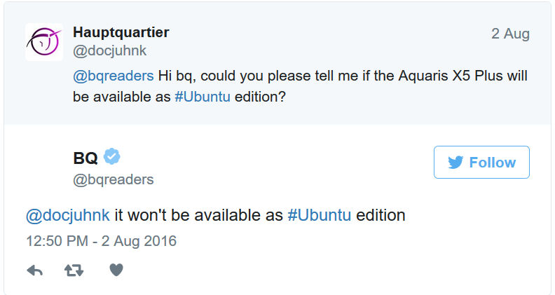 ‘Hauptquartier‘ ha twittato alla compagnia Spagnola chiededo se l’Aquaris X5 Plus sarebbe stato rilasciato anche nell’Ubuntu edition: