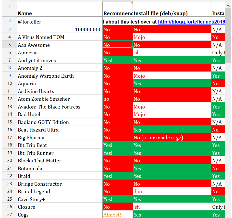 Così come molti di noi ha comprato numerosi Humble Bundles negli anni. Il signor Roum, non si è limitato ad acquistare numerosi game bundle, ma dopo aver tentato di giocarci si è stufato di non vederli funzionare su Linux e si è attivato. Ha così deciso di stilare una lista, che a oggi consta di ben 100 giochi tutti rigorosamente DRM-free, in cui ha riportato metodicamente numerose informazioni per ogni gioco: il tal gioco funziona? O è necessario un workaround più o meno complicato per farlo andare? Oppure non funziona proprio? Tutte queste domande trovano risposta.