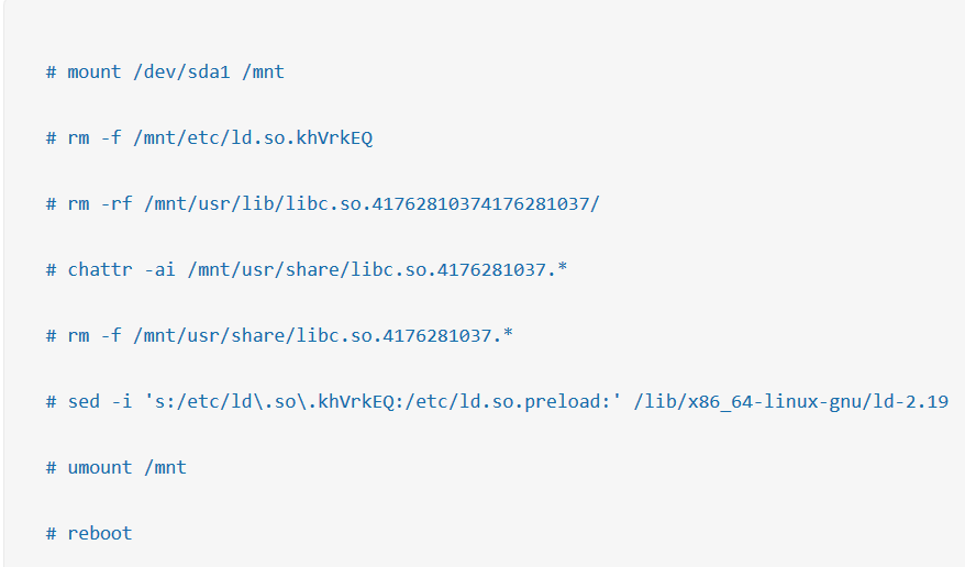 - Restore the attributes of the files /usr/share/libc.so.<random>.<arch>.*.so and remove them as well.