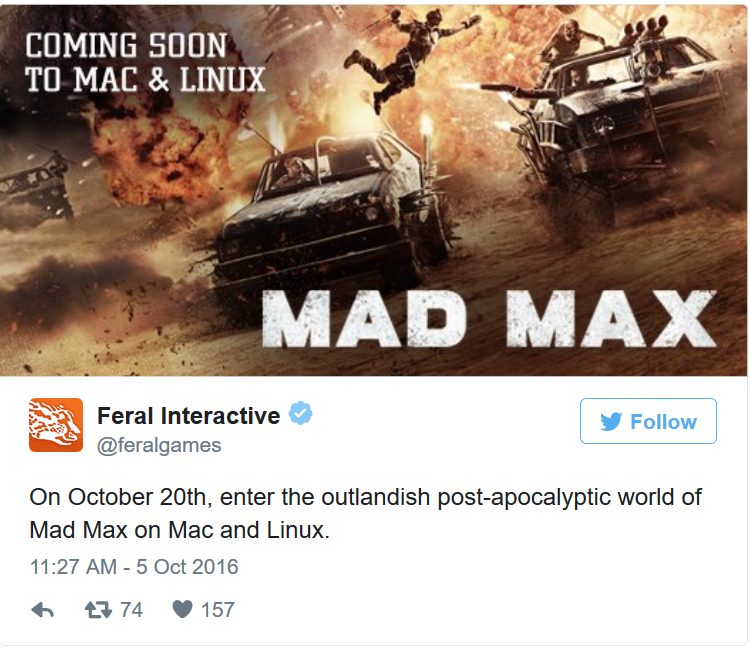 Feral Interactive ha annunciato il porting di Mad Max, videogioco action adventure open-world, su Linux e Mac.