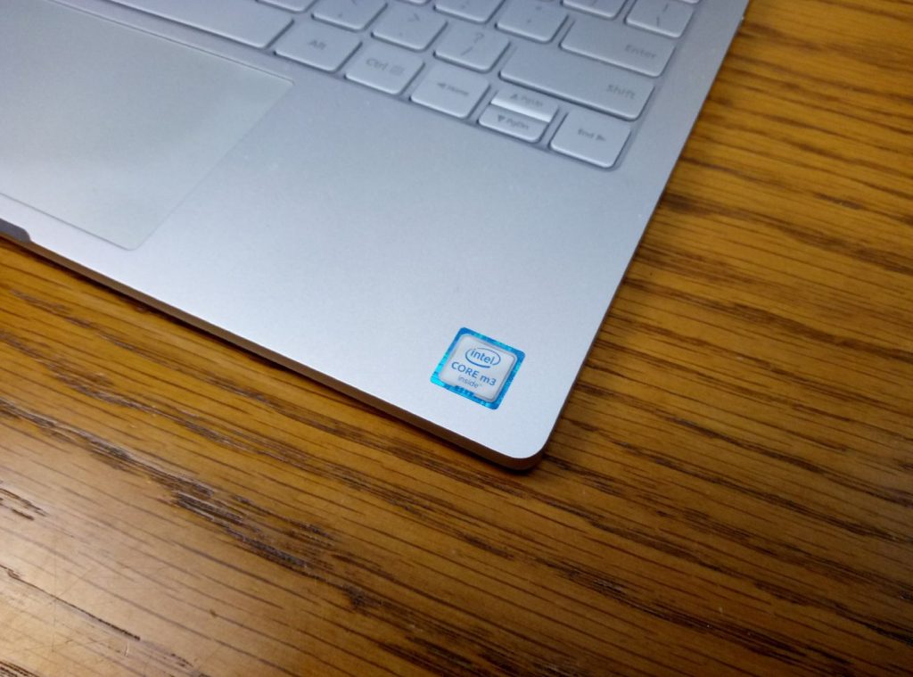 Passando alla parte bassa, invece, troviamo il touchpad centrale e, a destra, il logo Intel Core m3.