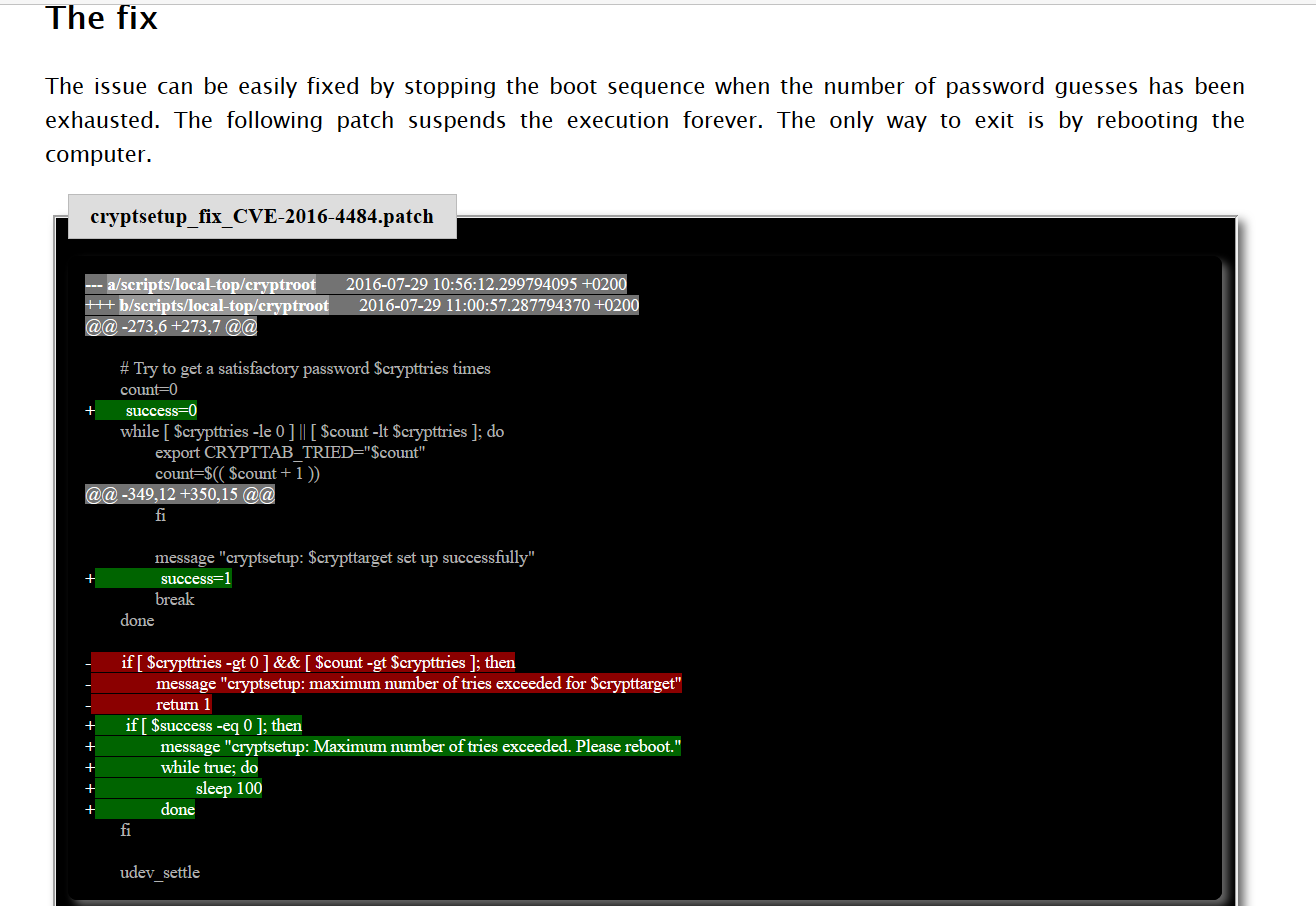Il sistema di autenticazione dovrebbe consentire un numero massimo di tentativi (tre come impostazione predefinita) per l’inserimento della password. A causa di una patch di sicurezza non molto furba il software gestisce in maniera errata il controllo della password e continua il processo di avvio del sistema, comportandosi come se il mancato accesso ai dati sul disco fosse dovuto ad un problema con il dispositivo.