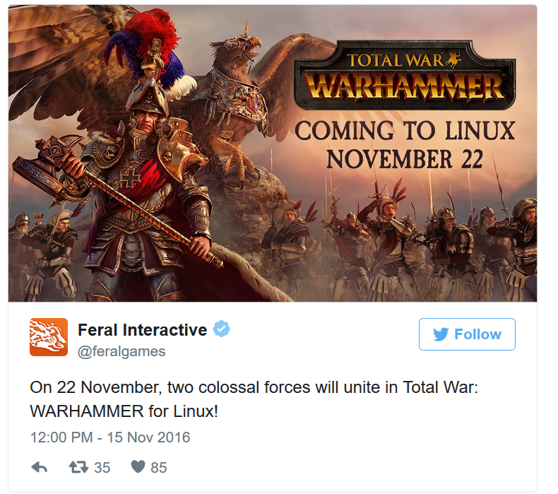 Feral Interactive, attraverso le parole di Rajitha Ratnam, ha annunciato che Total War: WARHAMMER arriverà su Linux il prossimo 22 Novembre.