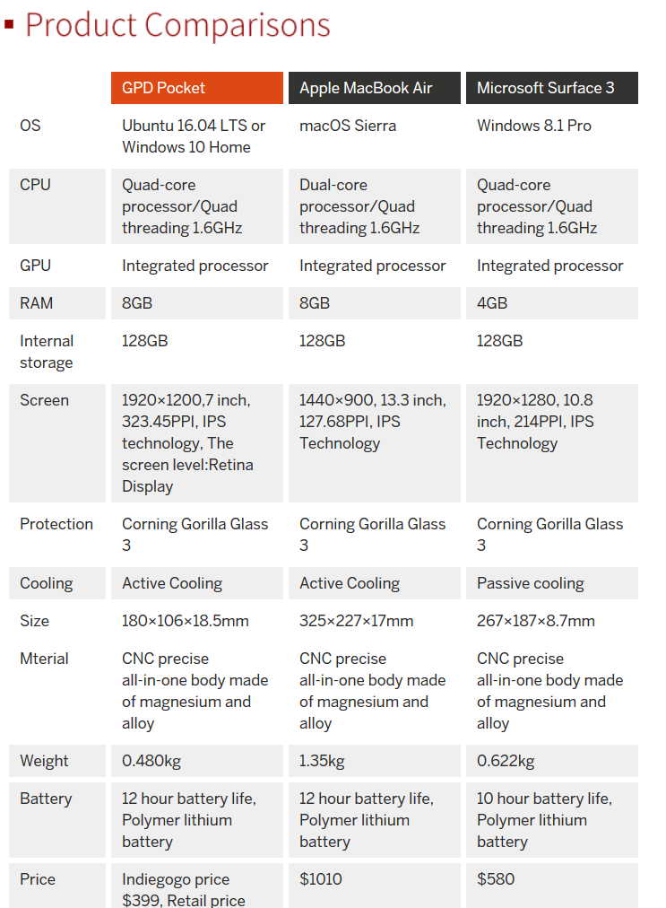 Nella schermata sopra potete apprezzare un confronto tra il Pocket, il Macbook Air e il Surface 3.
