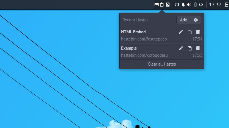Il primo di cui vi voglio parlare è Haste. Se dovete abitualmente condividere frammenti di testo o codice, script o altro Haste fa al caso vostro. Vi permette di modificare e inviare rapidamente del testo attraverso il servizio Hastebin direttamente dal destkop. L’applet tiene in memoria la storia del testo che avete condiviso così potete facilmente leggerlo, modificarlo, cancellarlo o inviarlo nuovamente.