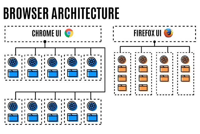 Safari utilizza un modello simile, ma non identico, che in ultima analisi consuma meno RAM di Chrome, e anche Edge utilizza processi multipli. Non è quindi sorprendente che Pollack (responsabile marketing Mozilla) abbia confrontato l’appetito di memoria di Firefox 54 principalmente con Chrome; il manager ha dichiarato che in un test con 30 schede quest’ultimo ha richiesto fino a 2,4 volte la RAM necessaria a Firefox.