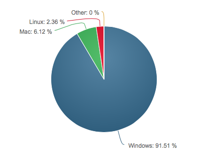Come potete vedere dal grafico sul sito netmarketshare Linux negli ultimi mesi è sempre stato attorno al 2%. macOS si prende un buon 6.12% mentre combinando i vari OS di Microsoft la casa di Redmond si prende (quasi) tutta la torta col 91.51%.